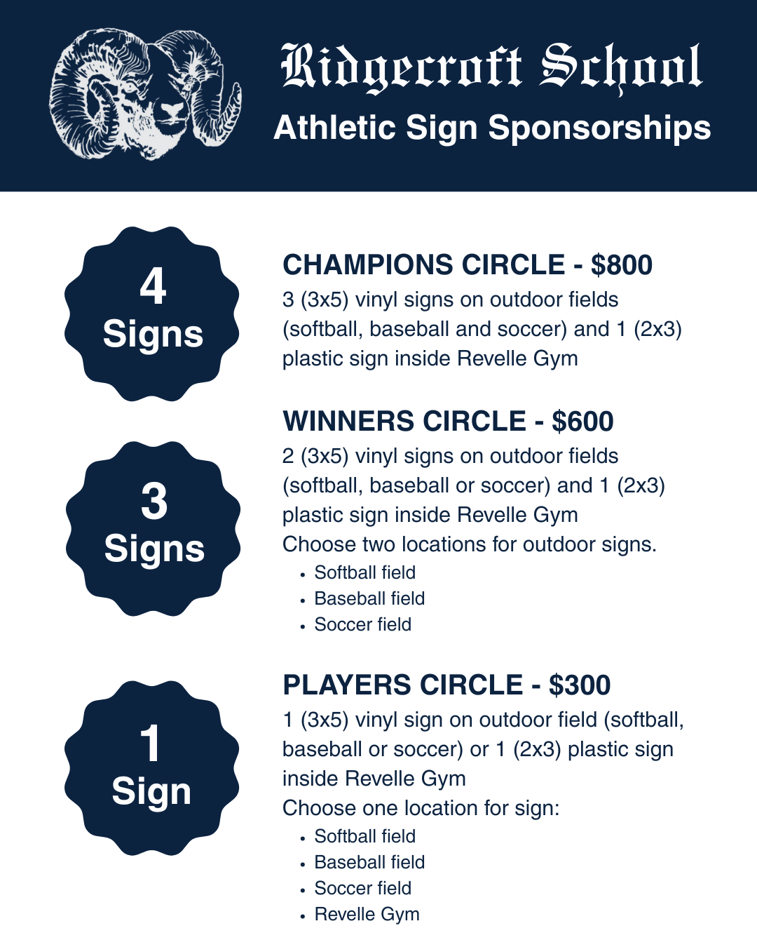 Our Sign Sponsor packages run through June 30 of each school year, and we will renew Sign Sponsor agreements each summer. We accept corporate sponsors as well as family sponsors to join us!